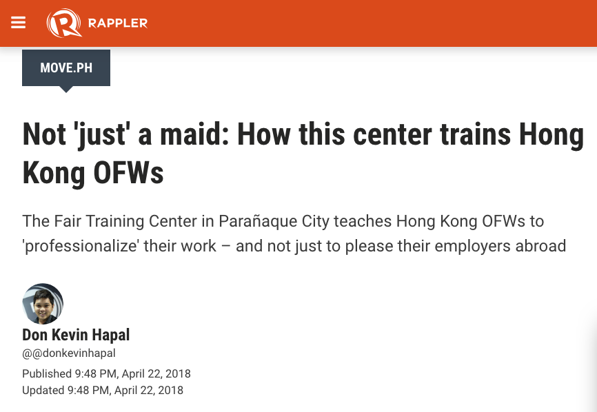 "Not 'just' a maid: How this center trains Hong Kong OFWs"Fair Training CenterApr 22, 20181 min readOur training and approach was featured on Rappler, 22 April 2018 - "Not 'just' a maid: How this center trains Hong Kong OFWs"